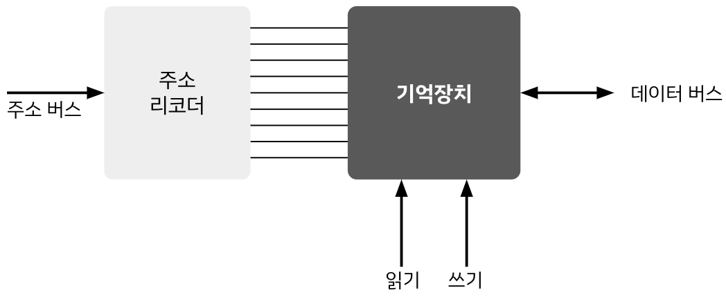 - n개의 입력 선은 디코더에 의해 2^n개의 주소가 존재 = 2^n개의 워드가 존재하는 것과 동일한 의미