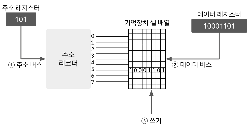 - 3단계 : 주소에 근거하여 선택된 기억장치 주소 디코더 위치 5에 데이터 저장하여 쓰기 동작 완료