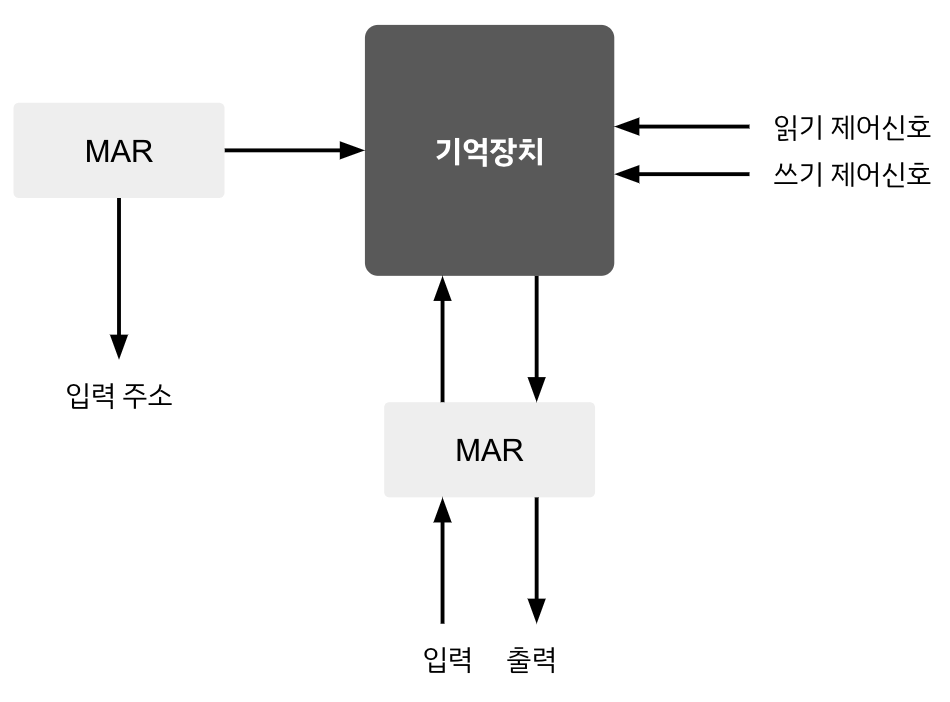 - 저장 : 수행 결과를 주기억장치에 다시 저장. MAR에 저장되어 있는 주소 번짇에 해당하는 주기억장치 위치에 MBR에 저장되어 있는 데이터 저장